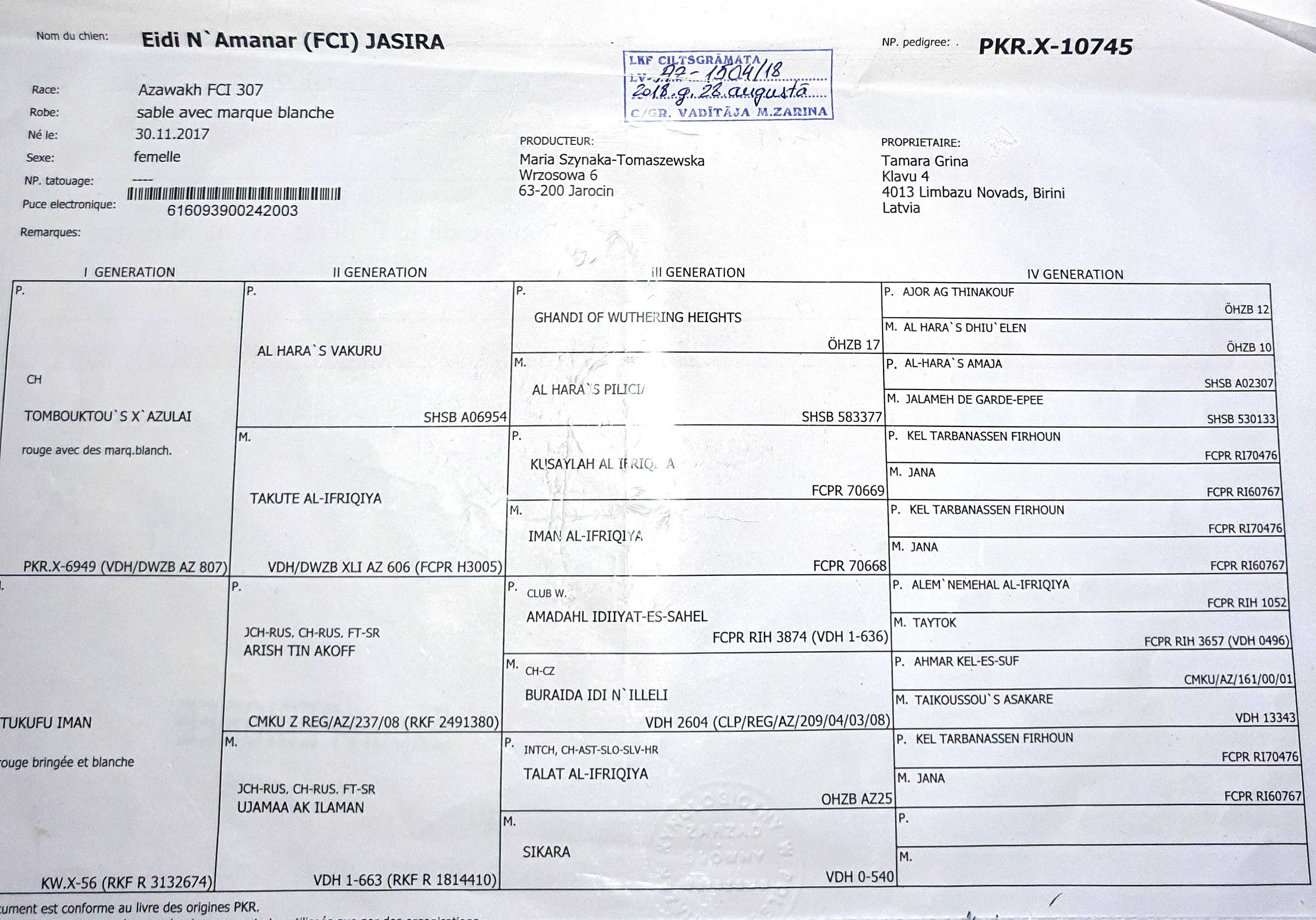 | Suņa vārds / Name | Eidi N`Amanar Jasira |